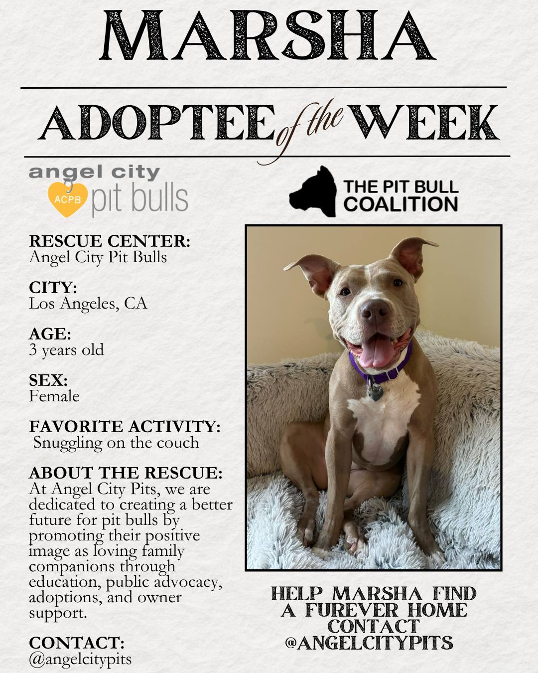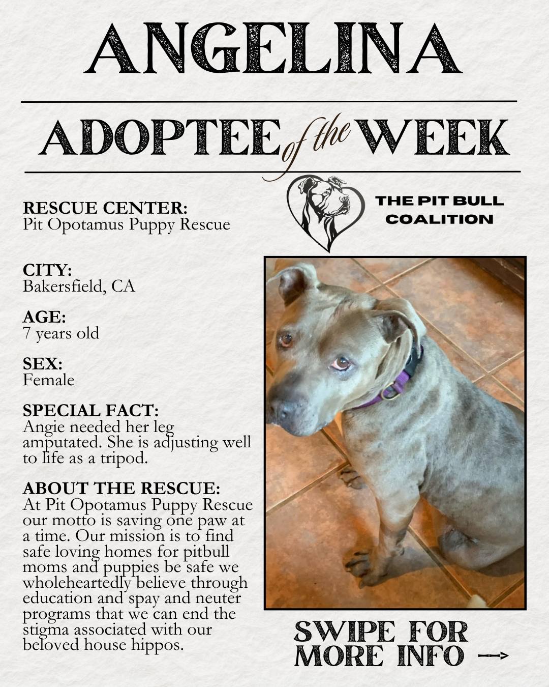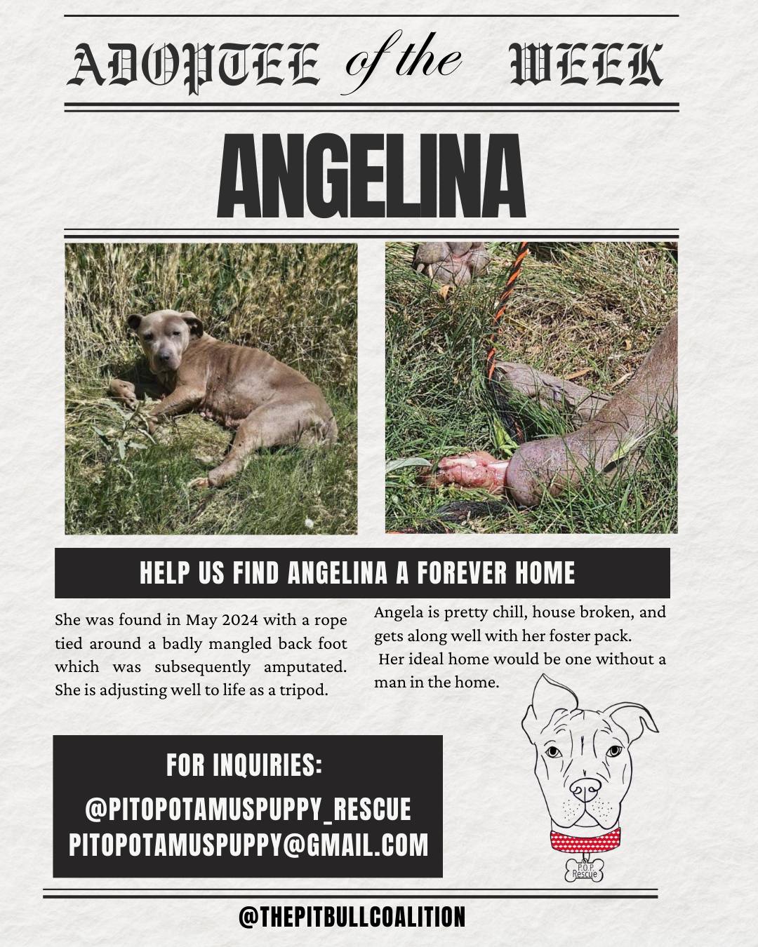 At The Pit Bull Coalition, we strive to unite all pit bull-centric rescues to speak in one powerful, collective voice. Our mission focuses on education about the true nature of all bully breeds, and promoting responsible pit bull ownership. Together, we are taking on the challenges faced by our beautiful bully breeds and by us rescues, which include overturning Breed Specific Legislation, wiping out dog fighting, promoting spay and neuter, and most of all, helping to reduce the shelter population by focusing on supporting the “Adopt, Don’t Shop” movement.